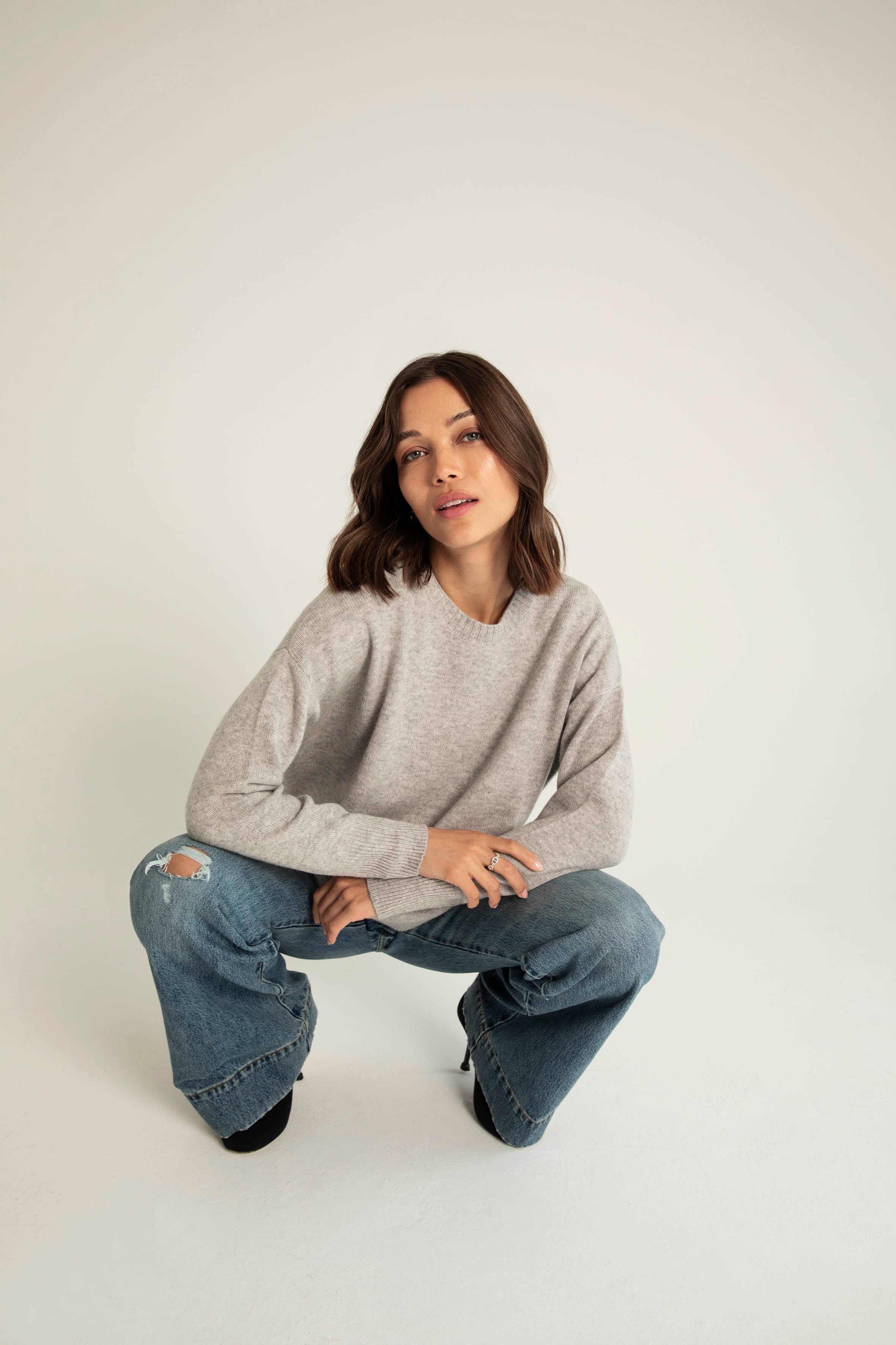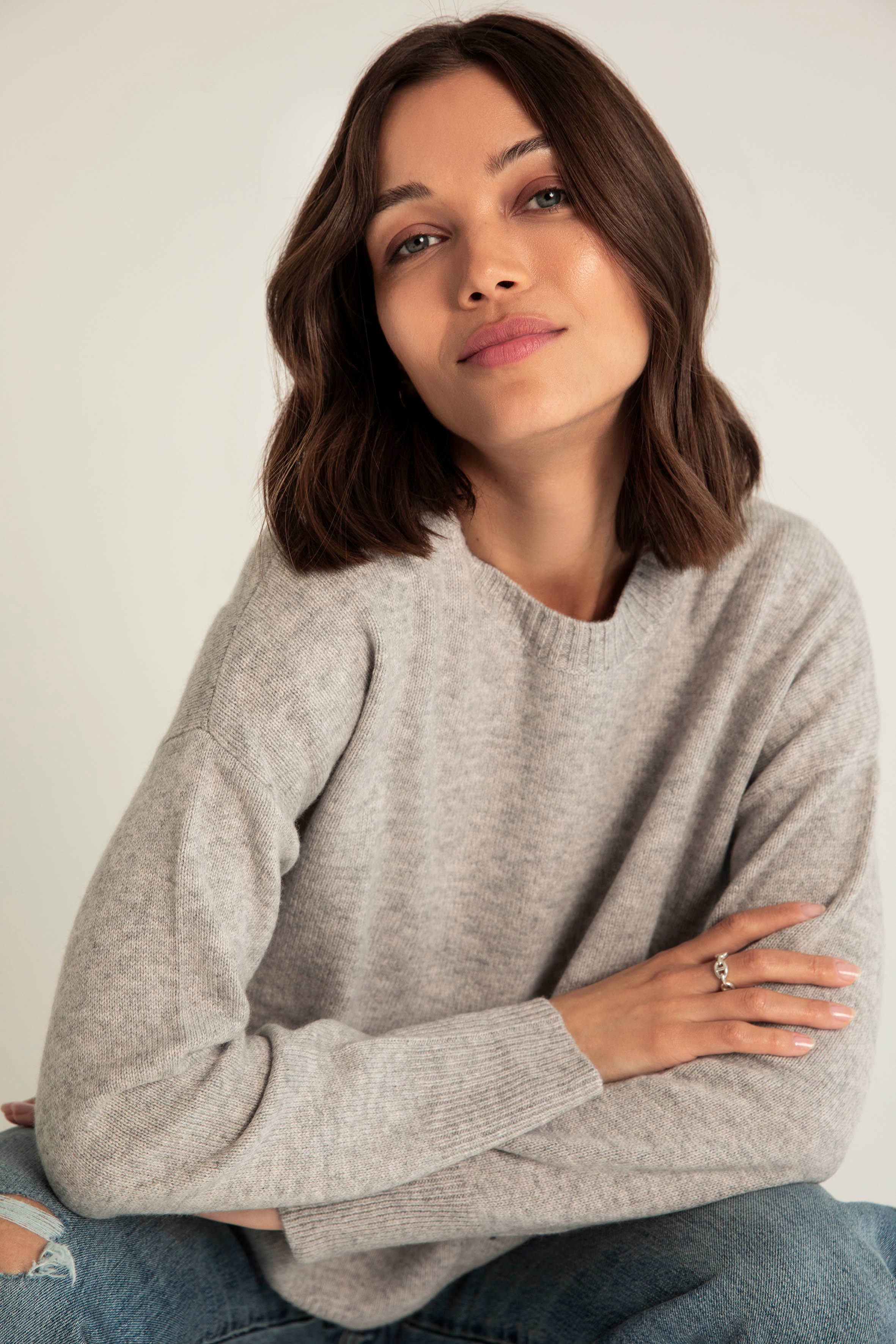 A gorgeous crew neck sweater in a boxy relaxed shape with ribbed detail on the neck, cuffs and bottom cuff.