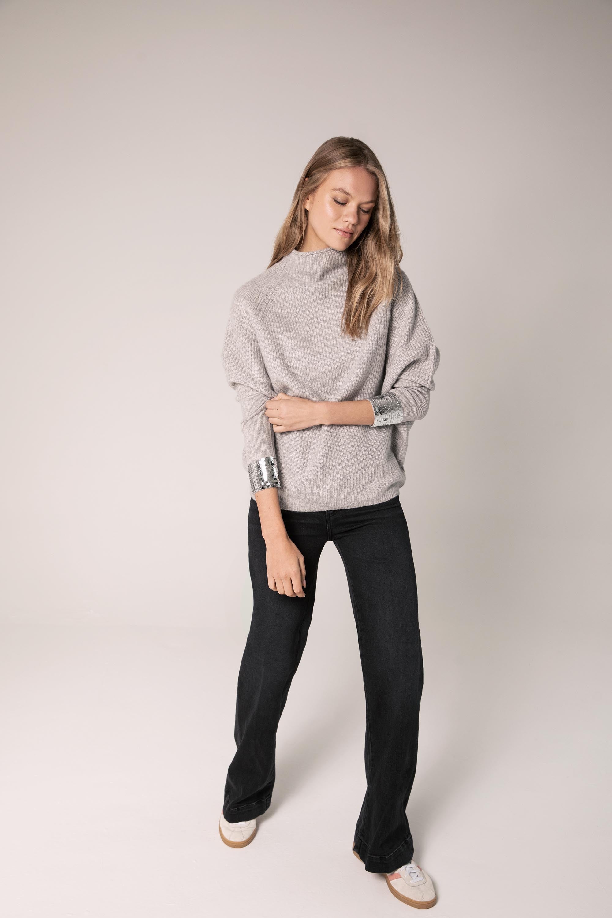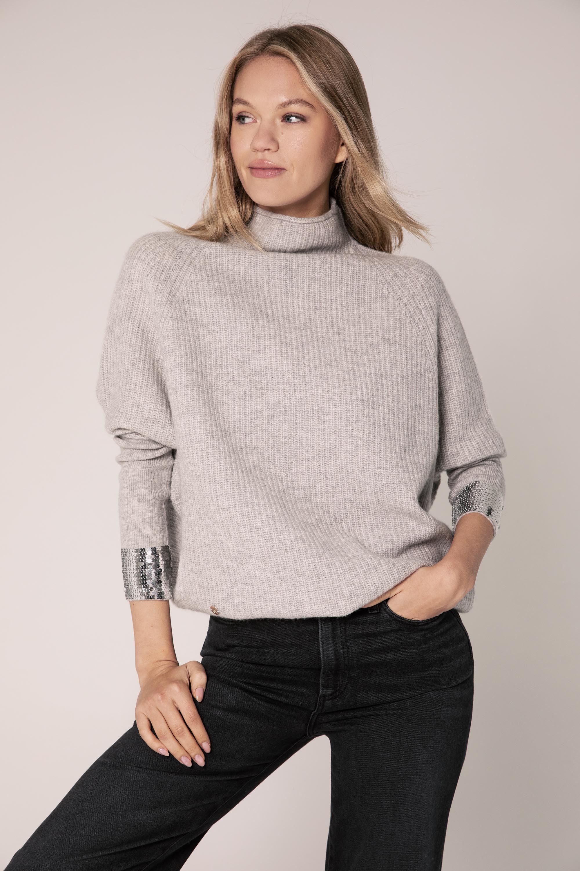 This chunky ribbed cashmere sweater has a low turtleneck with slouchy, relaxed arms that make it an everyday wardrobe winner. It's a super-relaxed style with silver sequins on the cuffs to add a touch of sparkle