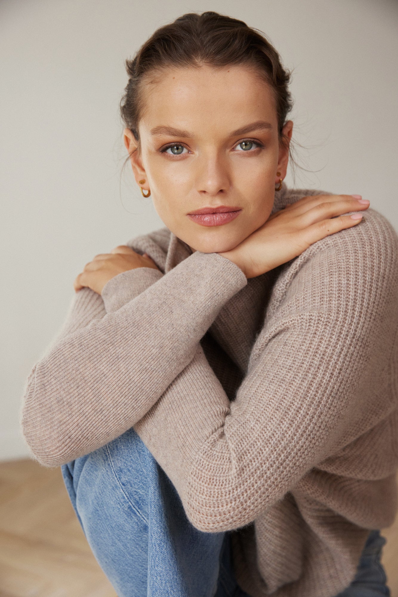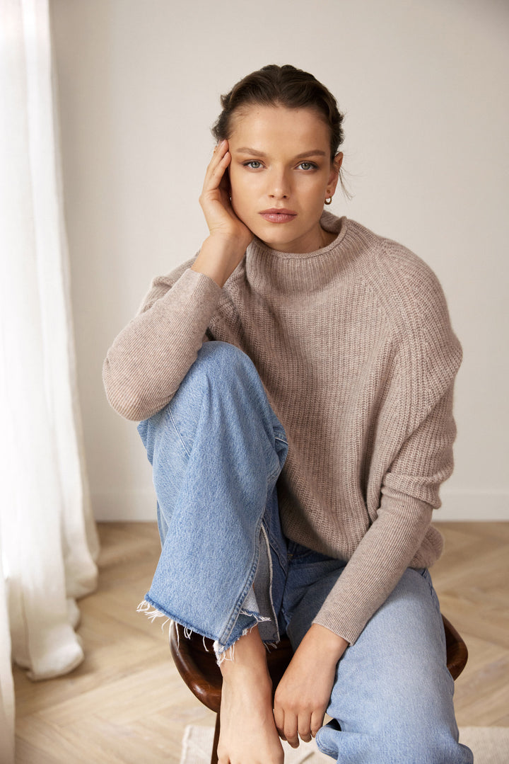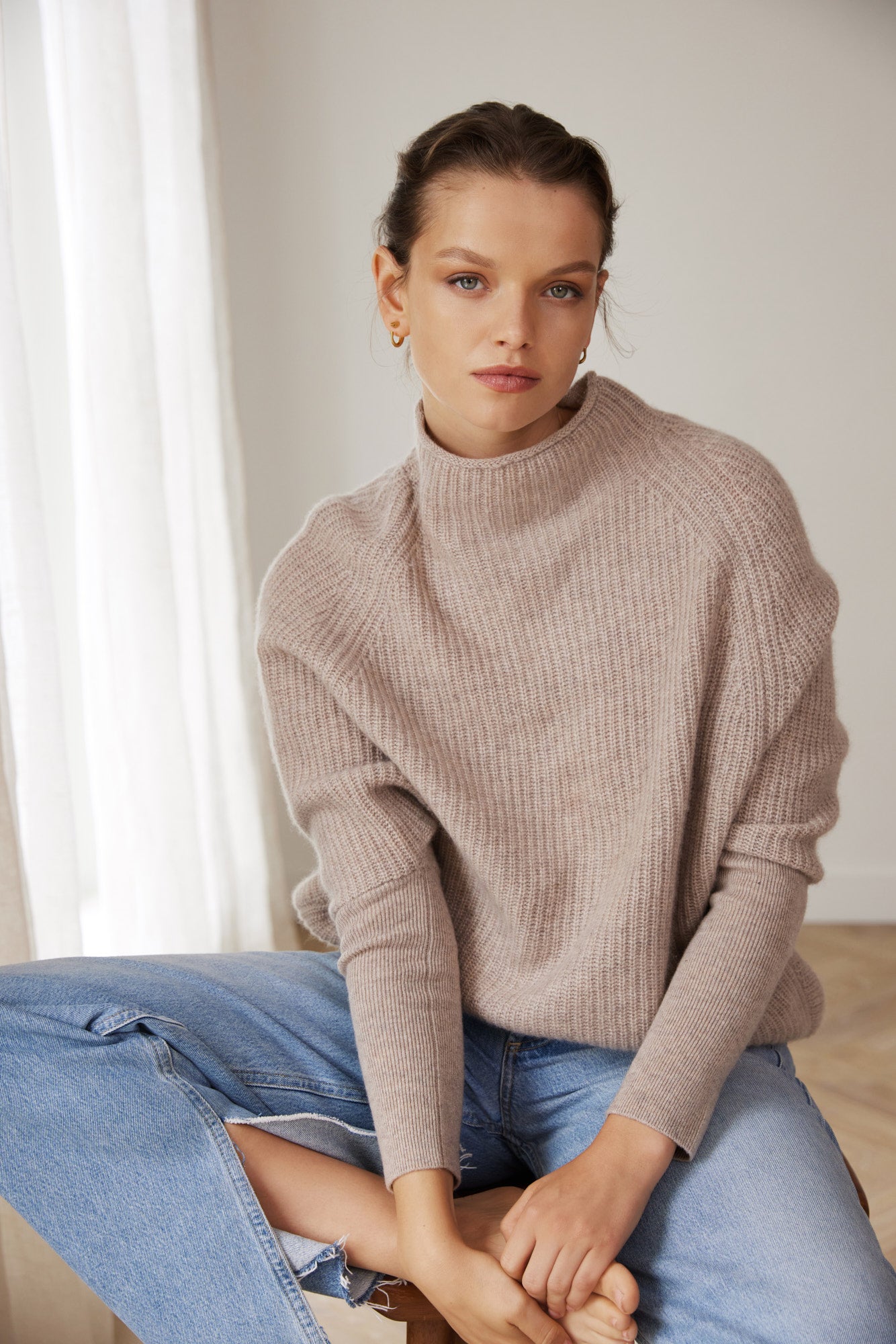 Our chunky ribbed cashmere sweater with a perfectly-placed low turtleneck is the ultimate slouchy wardrobe winner. Ease into everyday dressing with this super-soft cashmere beauty.