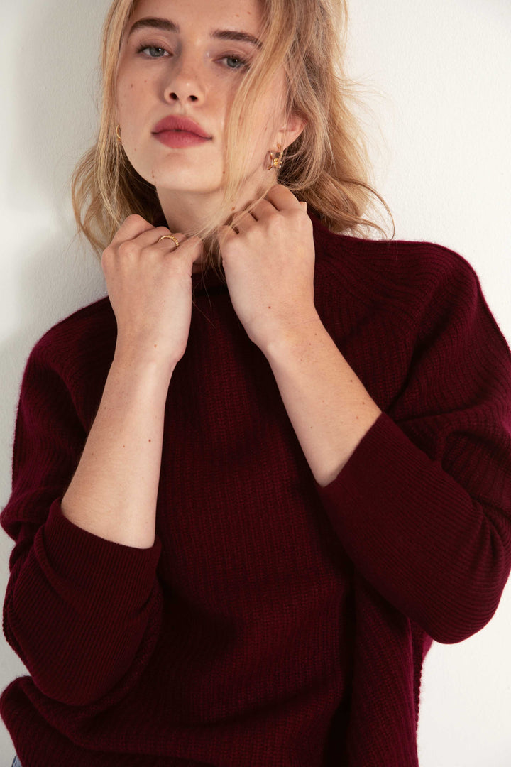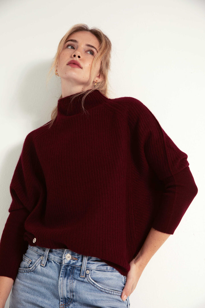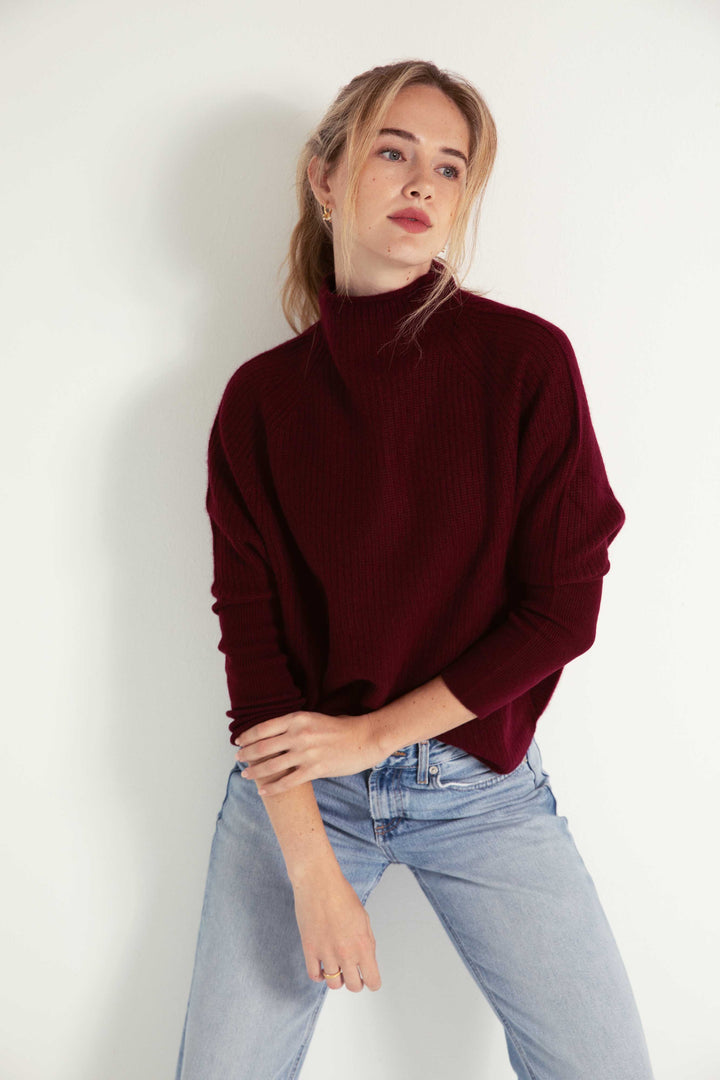 This chunky ribbed cashmere sweater has a low turtleneck with slouchy, relaxed arms that make it an everyday wardrobe winner. It's a super-relaxed style.