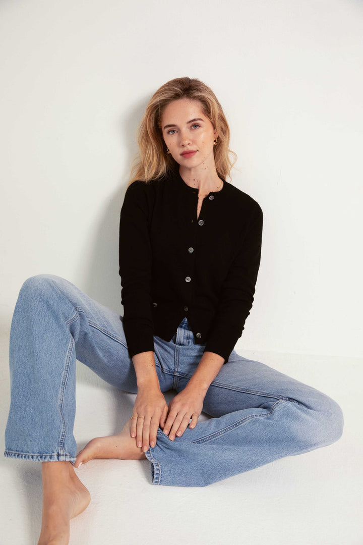 This is a classic lightweight cashmere cardigan with ribbed trim and delicate mother-of-pearl buttons. A timeless layering piece you will wear again and again — the effortless layer you’ll reach for every day, whether dressing it up or down