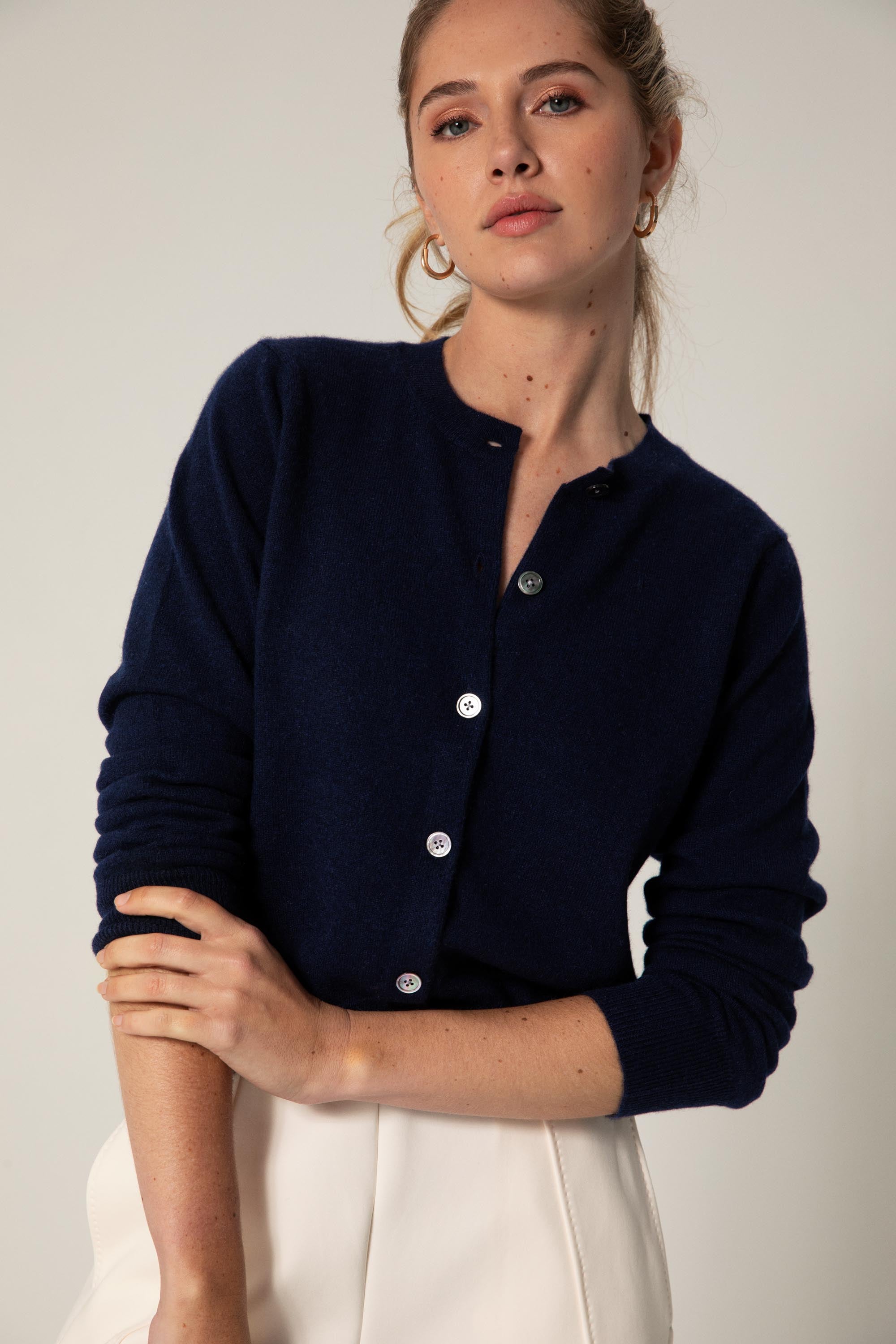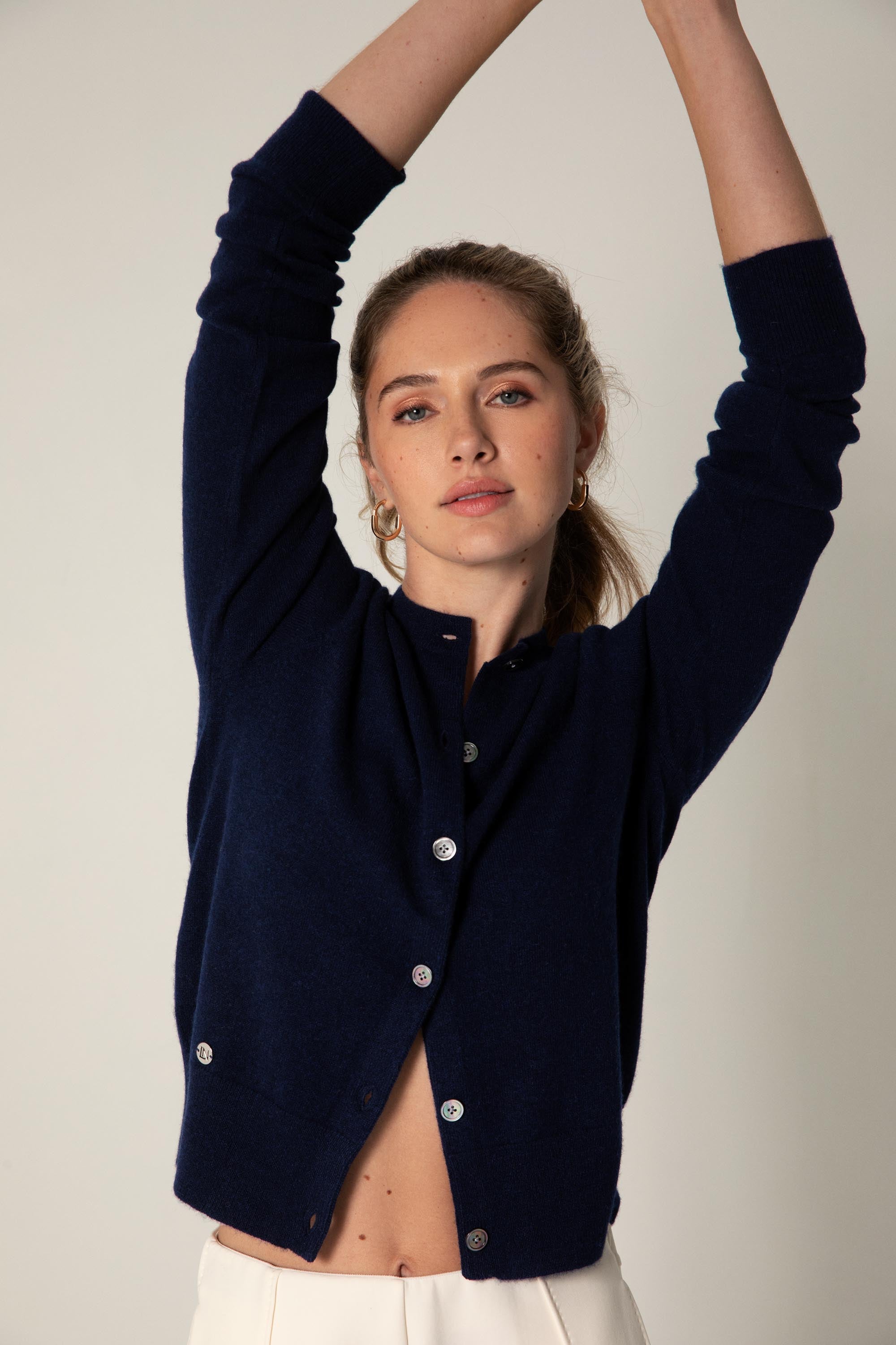 This is a classic lightweight cashmere cardigan with ribbed trim and delicate mother-of-pearl buttons. A timeless layering piece you will wear again and again — the effortless layer you’ll reach for every day, whether dressing it up or down