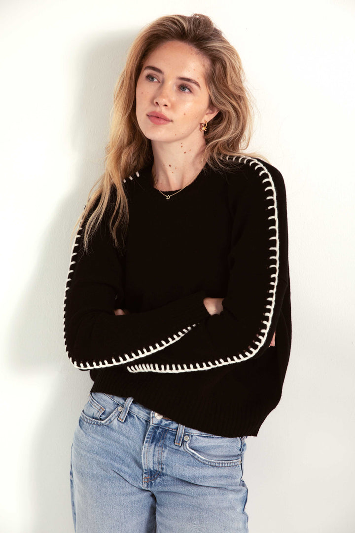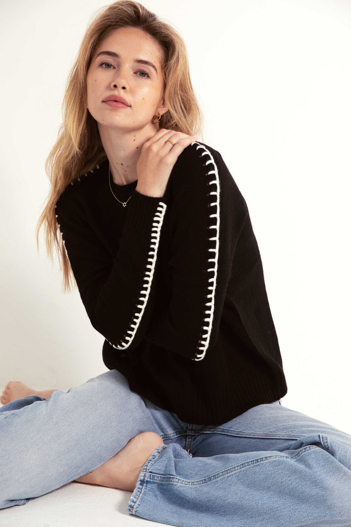 A gorgeous crew neck sweater in a loose, relaxed shape with stitch detailing in a contrasting colour along the edge of the arm and shoulder. A perfect statement piece to elevate your everyday casual look.