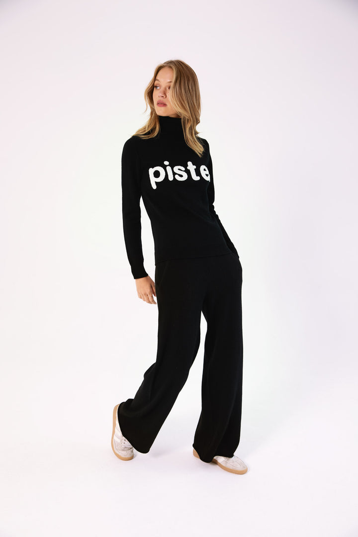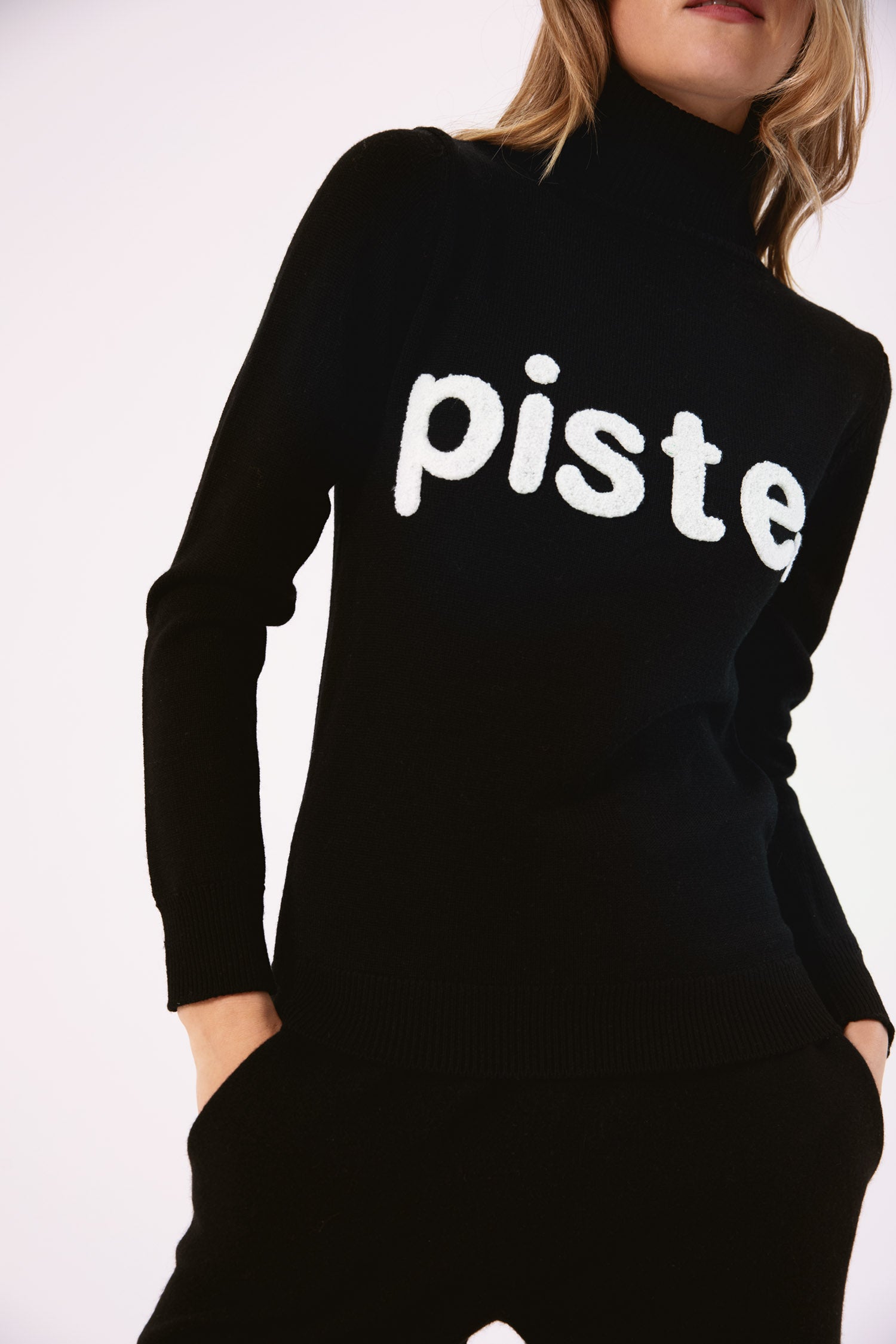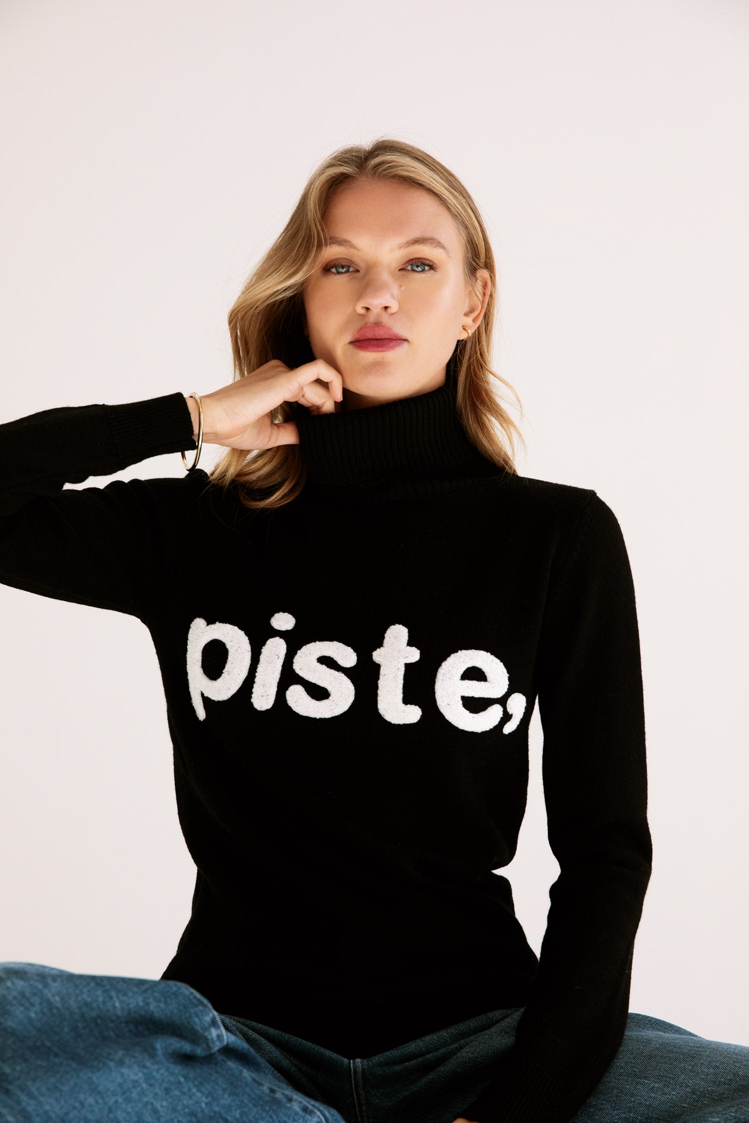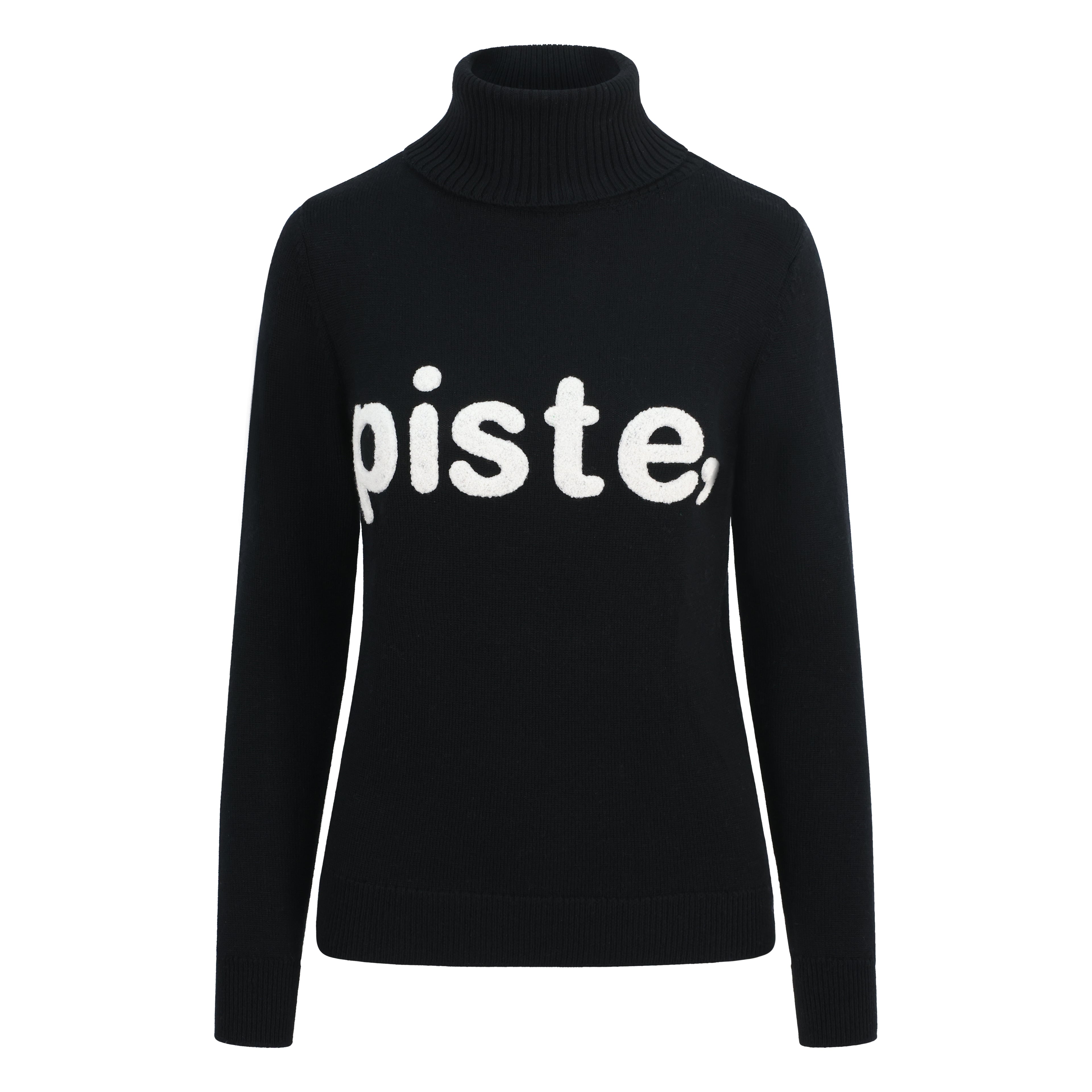 Going Skiing? Look your best on the slopes in our PISTE sweater made from luxurious soft merino wool, it has a chic turtleneck and our PISTE motif on the front.
