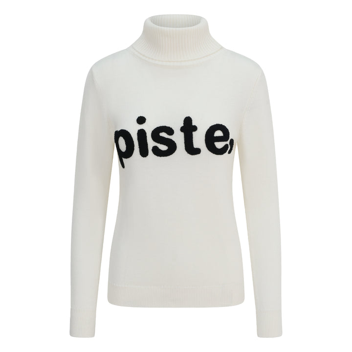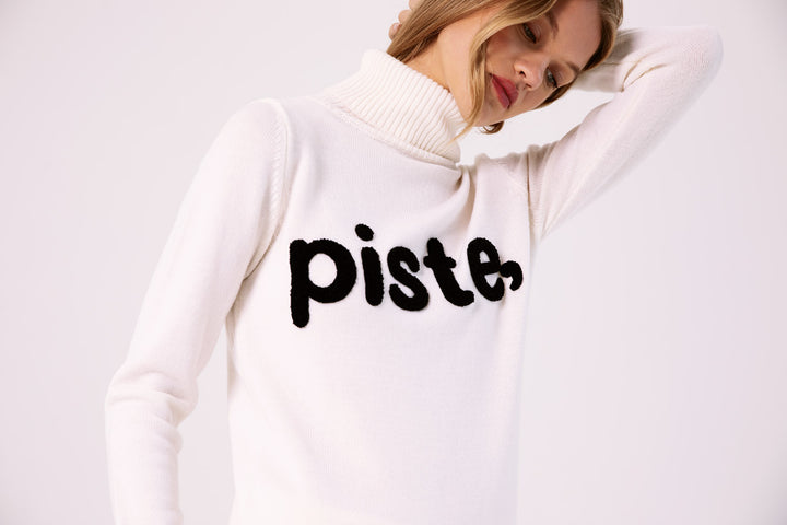 Going Skiing? Look your best on the slopes in our PISTE sweater made from luxurious soft merino wool, it has a chic turtleneck and our PISTE motif on the front.