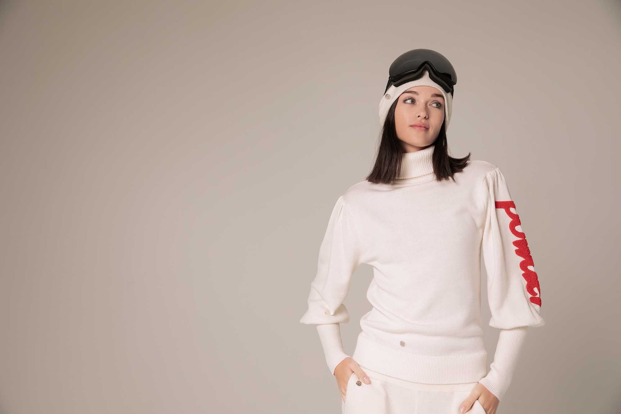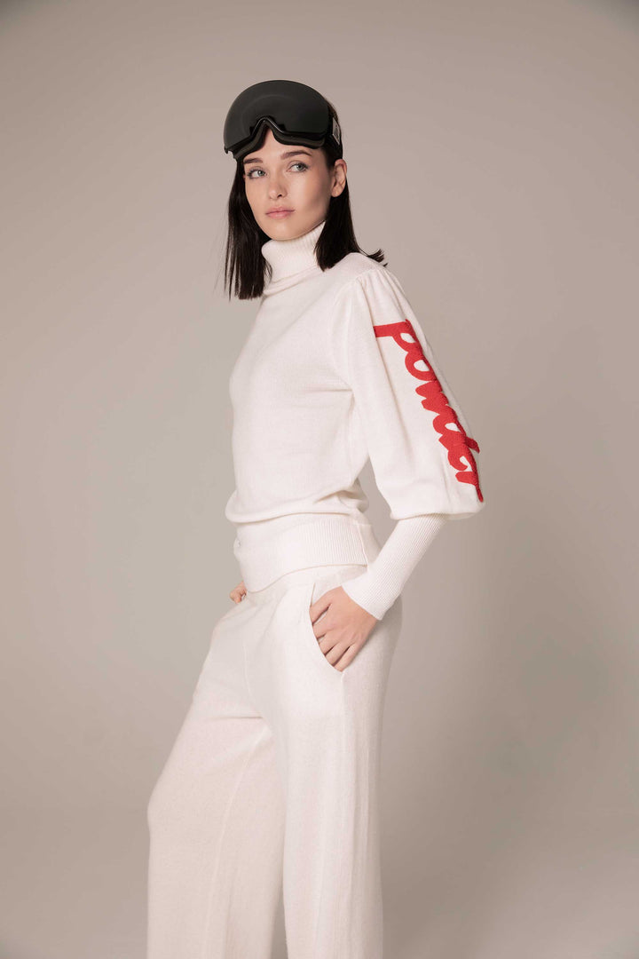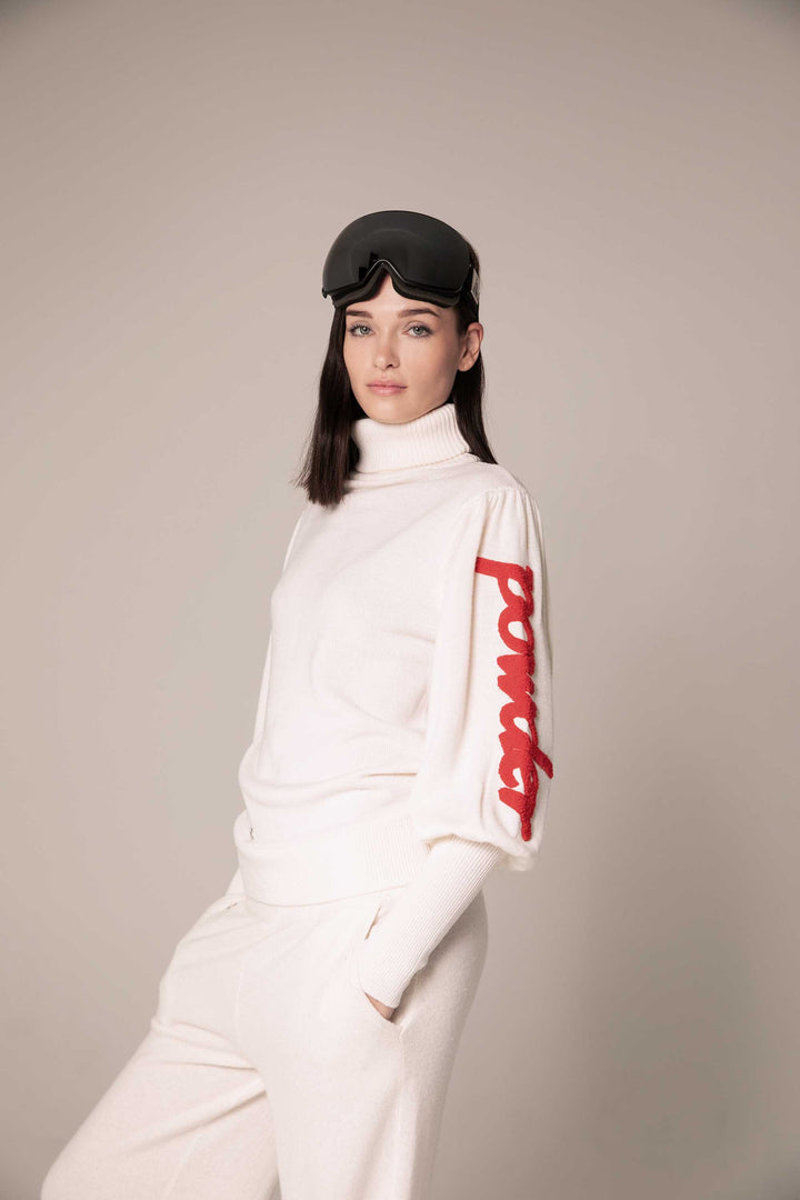 Going Skiing? Look your best on the slopes in our POWDER sweater made from luxurious soft wool, it has a chic turtleneck and comes in 2 colourways with our Powder motif down the sleeves