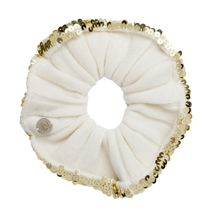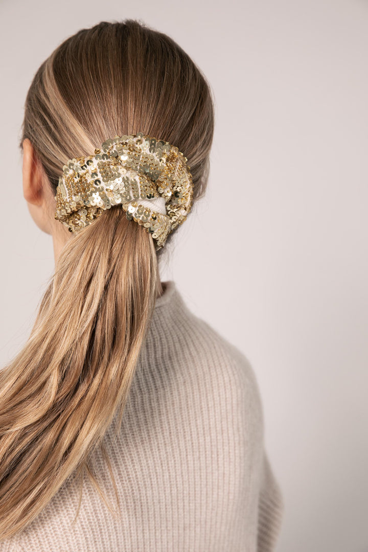 Elevate your everyday life with this soft, 100% pure cashmere scrunchie that delicately holds your hair without pulling. Adding a touch of sparkle with hand sewn gold sequins.
