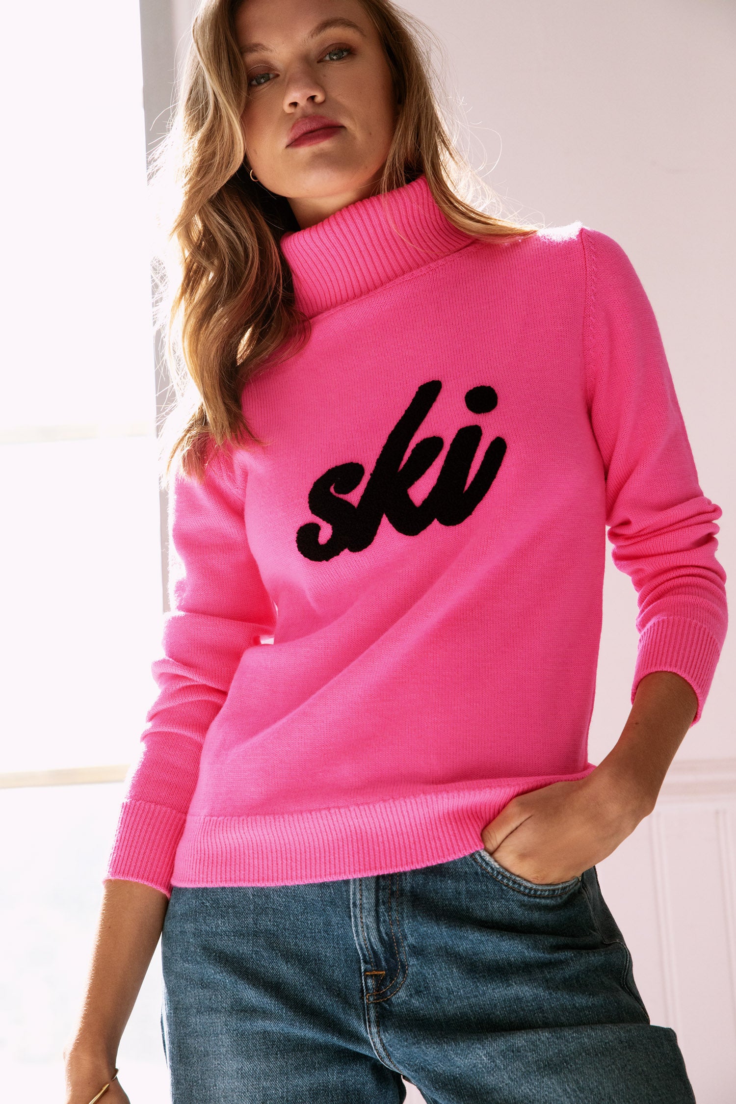 Going Skiing? Look your best on the slopes in our SKI sweater made from luxurious soft merino wool, it has a chic turtleneck and our SKI motif on the front.